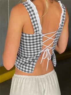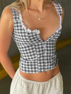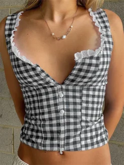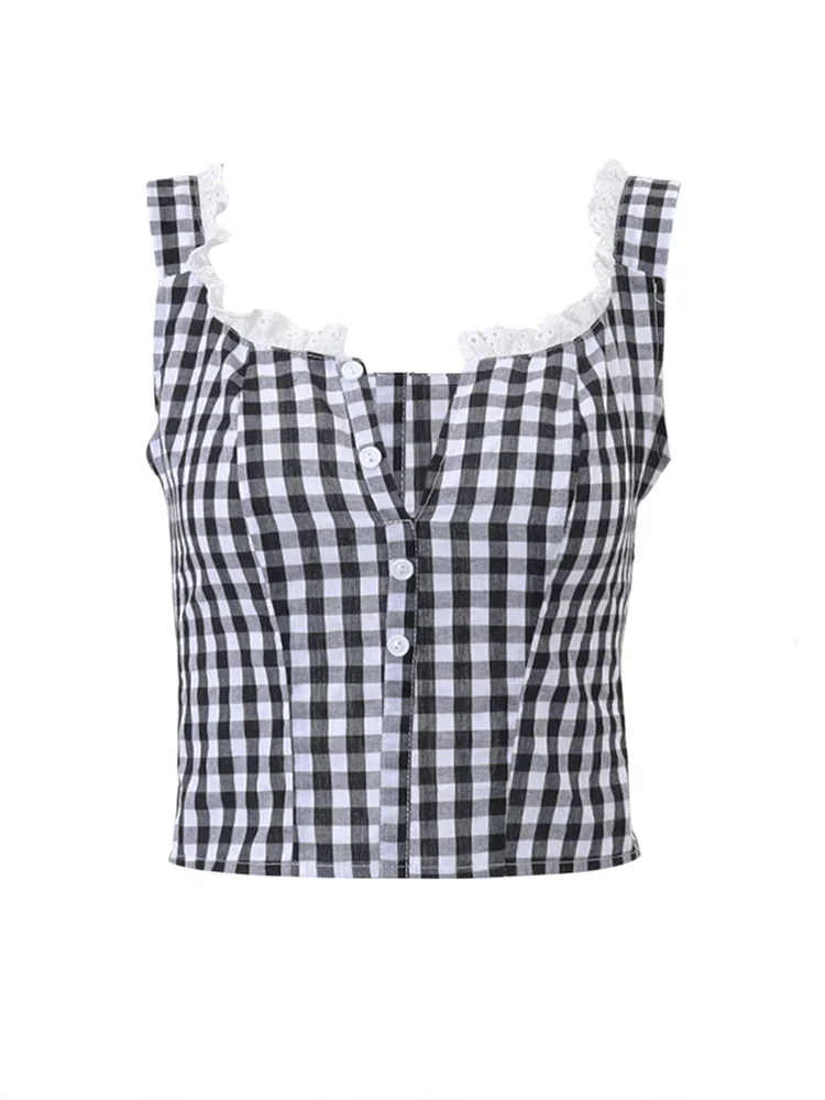 Women’s Summer Tank Tops Sleeveless Button Down Plaid Print Lace Trim Crop Tops Casual Shirts
