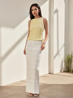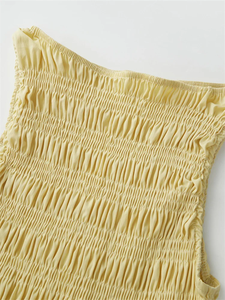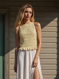 Women’s Summer Smocked Tank Tops Solid Color/Plaid Sleeveless Boat Neck Ruffled Hem Slim Fit Vest